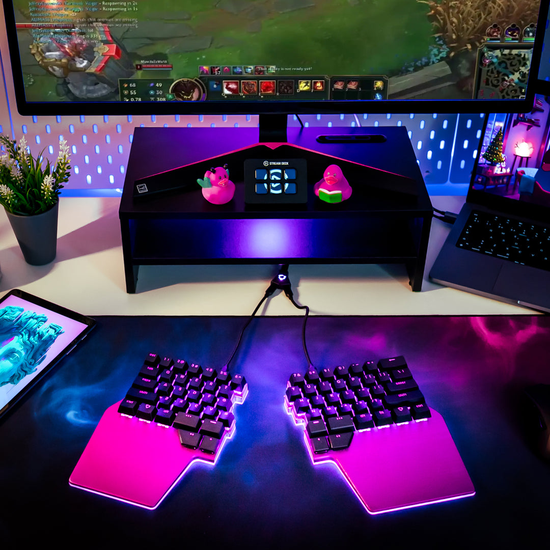 Turn your split keyboard into a huge macro pad for your software and say goodbye to twisting your fingers to press impossible shortcuts. Split the keyboard in half and place your tablet in the middle for an unbeatable modern workflow.