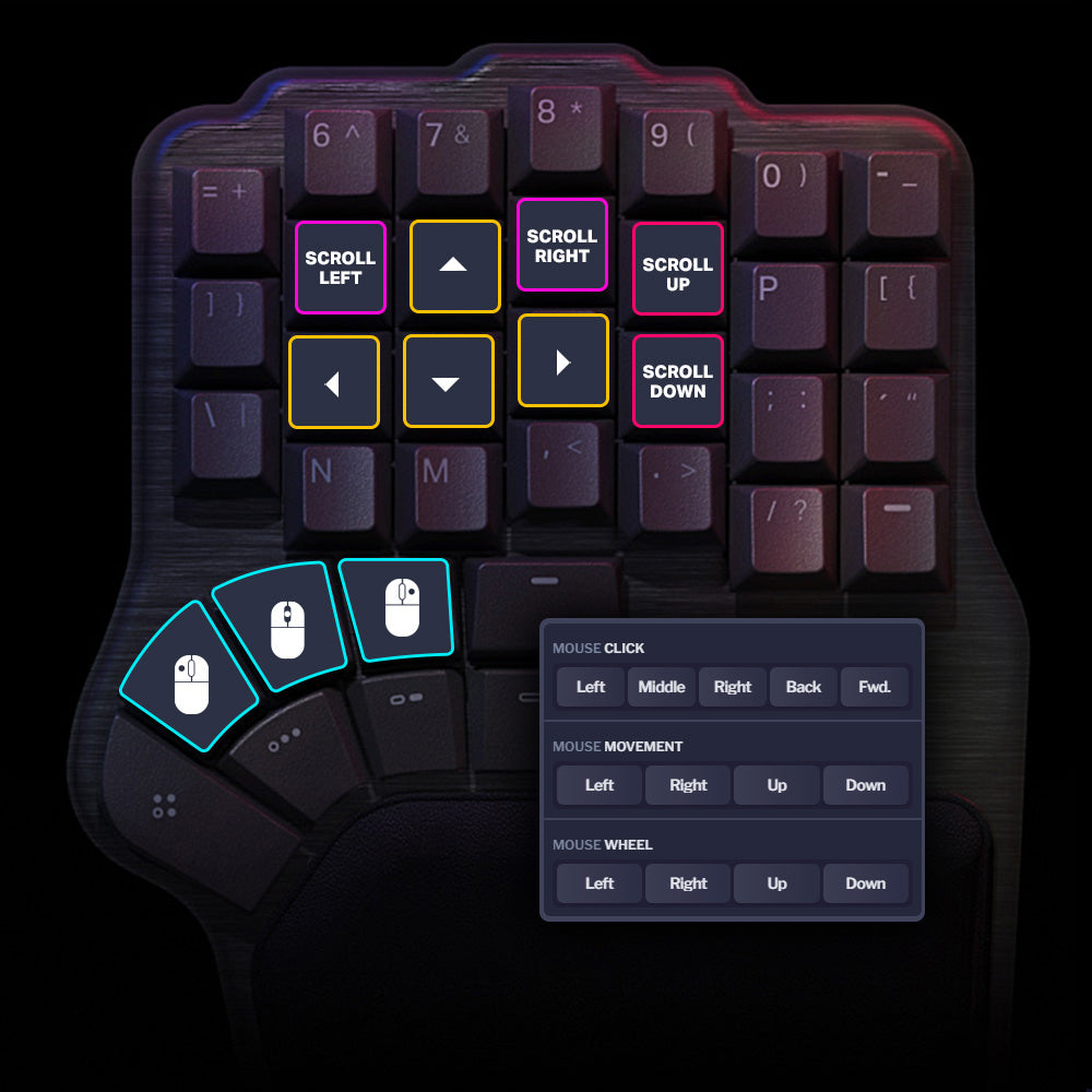 Bazecor allows you to bind mouse actions to your keyboard. You can configure mouse movement, clicks, or even the mouse wheel.