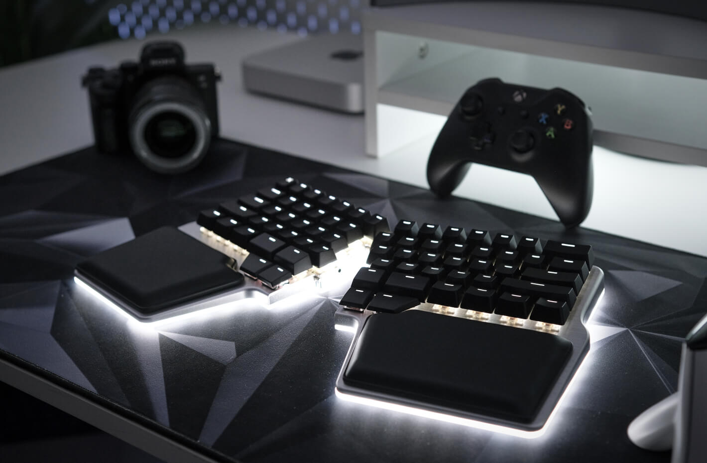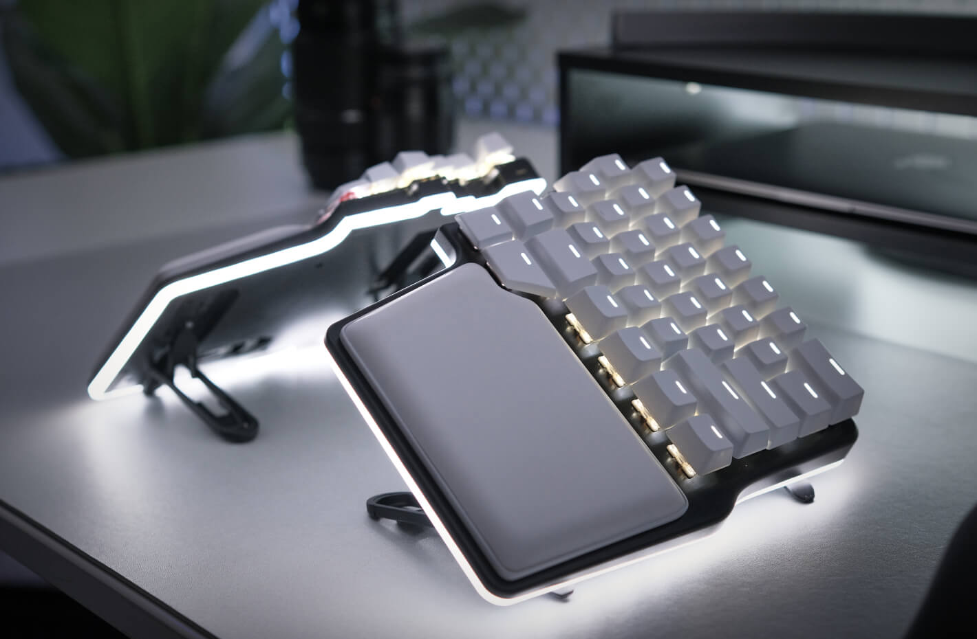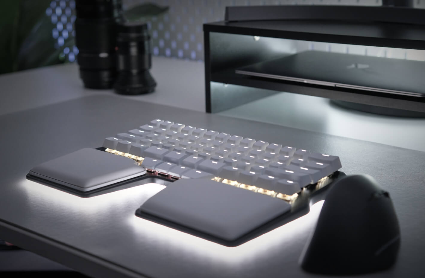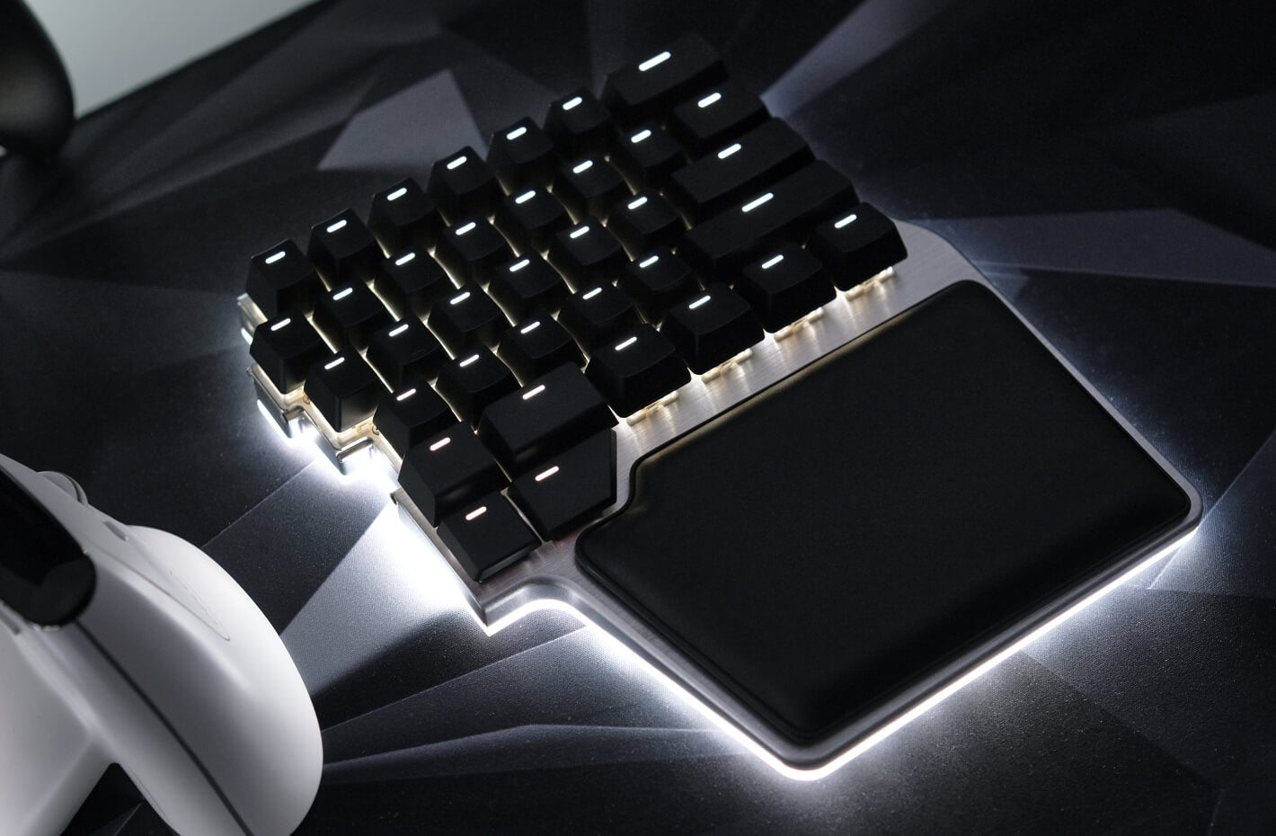 White Palm Pads and High Quality Laser-Etched keycaps for the Dygma Raise 2.