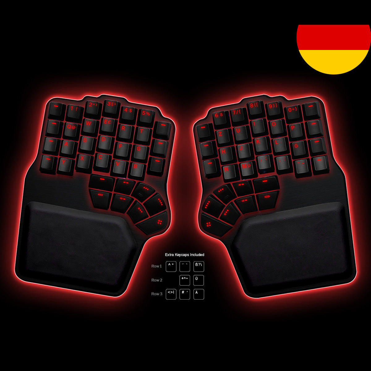The Dygma Raise mounts OEM profile keycaps and eight unique thumb keys.