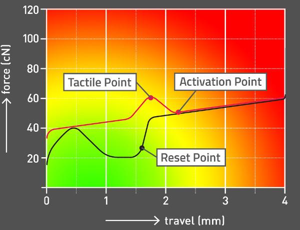Tactile position is where you feel the bump on tactile and clicky switches. On linear switches, there’s no tactile position.